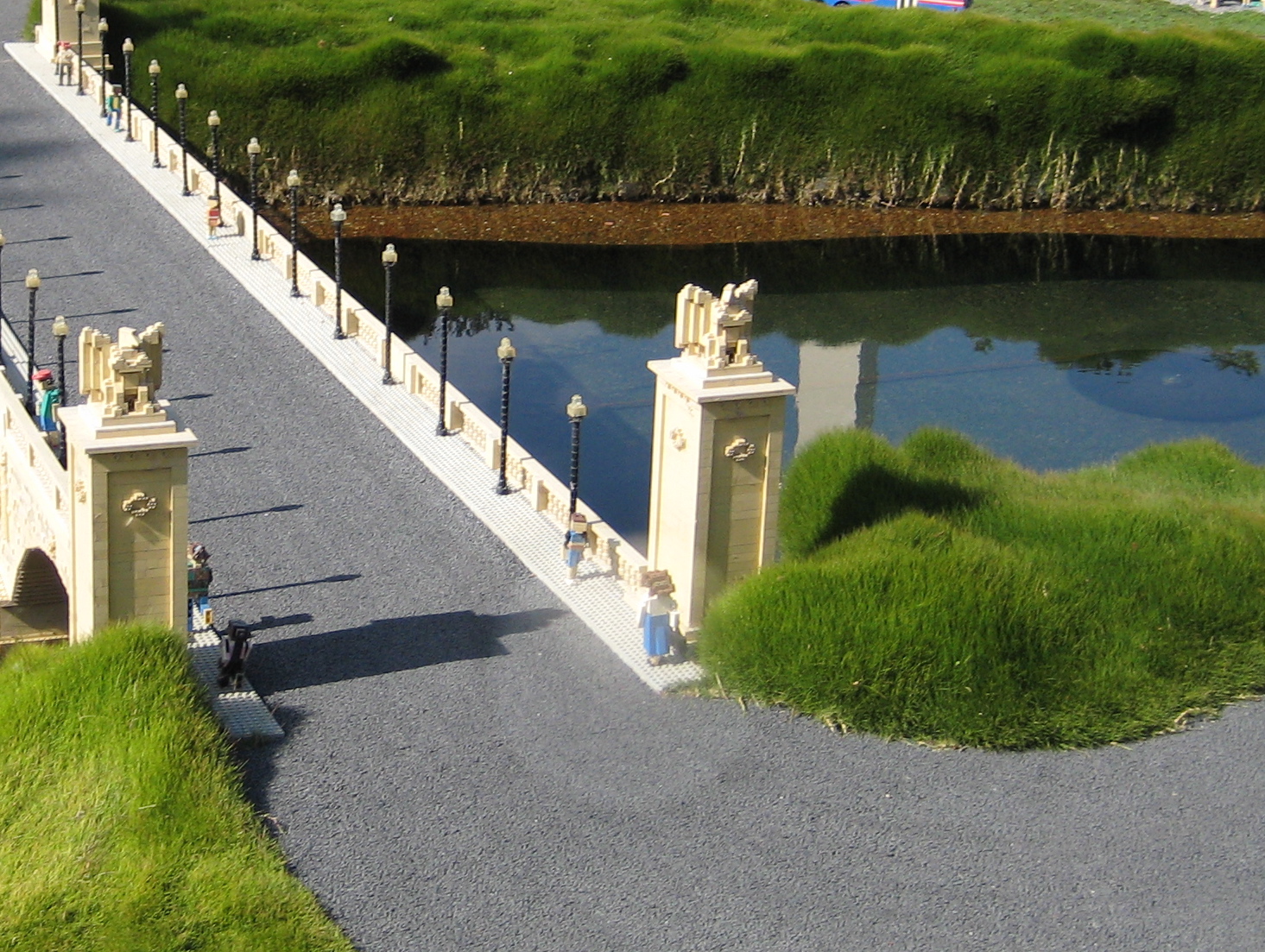 The lion on the fourth pedestal in Legoland has been replaced by a little boy. But he has a lion--and a magnifying glass.