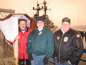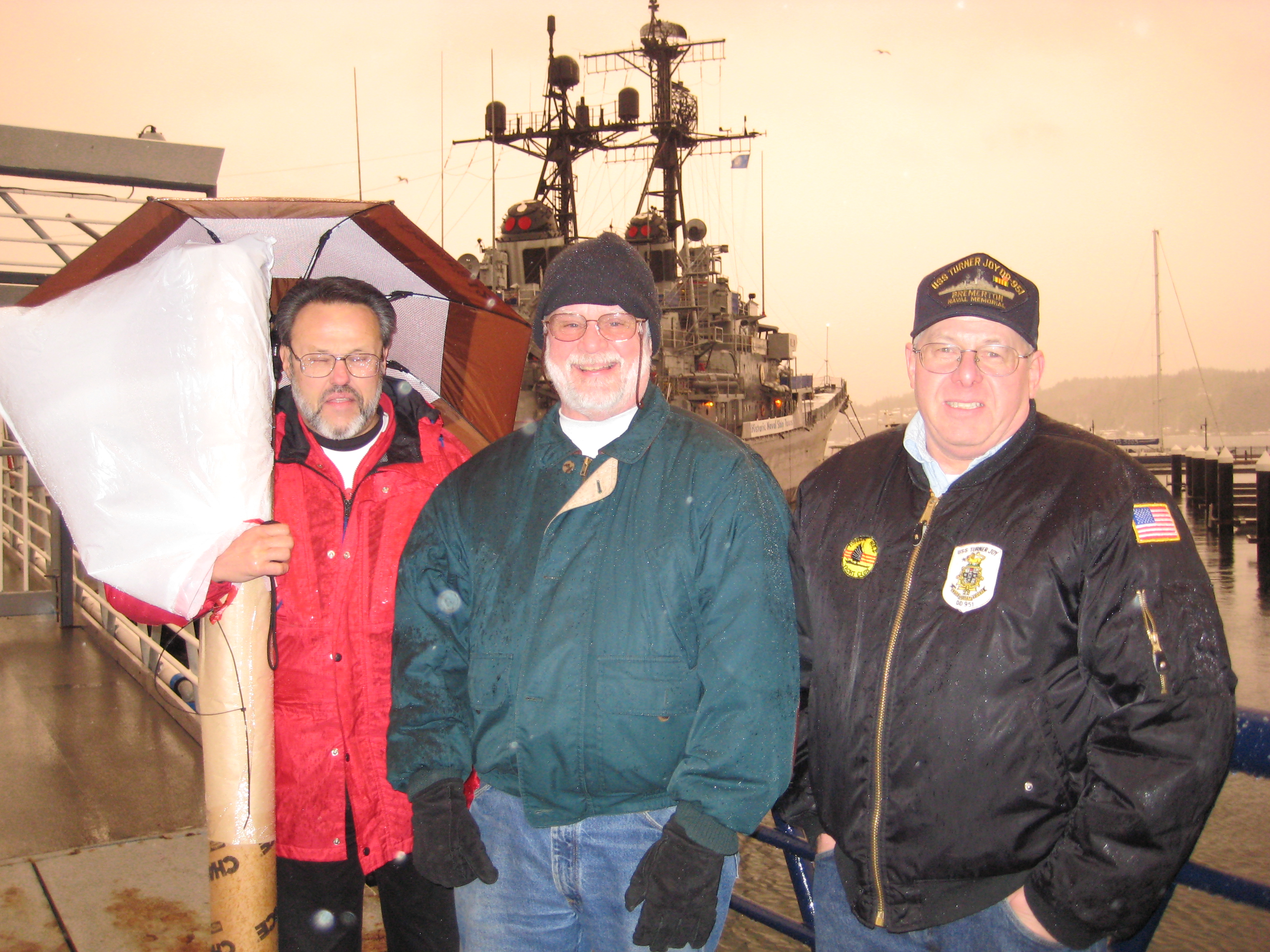 Took a ferry out to Bremerton yesterday with a huge contingent of my husband’s cousins. We didn’t get to go aboard the Turner Joy, which was keeping holiday hours, but I did get my picture taken in front of it for the sake of the pun. Cousin Jim ran into a couple of other Navy men who had also served in ‘Nam, and I got a picture of them together: